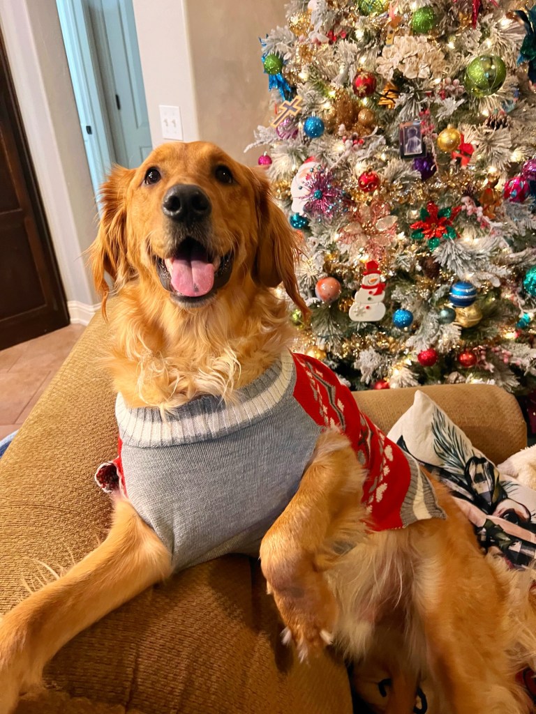 Here is Fynn from last Christmas (2023). Isn’t he handsome? Fynn is what we call an alpha Golden. He is well loved and loves back well.